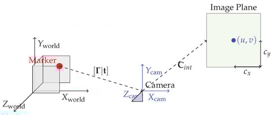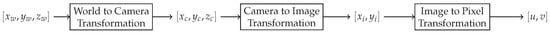 To accurately estimate the 3D positions of the markers on the satellite, it is necessary to transform the 2D pixel coordinates detected by the CNN module into 3D space. This transformation is achieved using both the intrinsic and extrinsic camera parameters. Figure 7 visually demonstrates how the camera transformation works from world coordinates to pixel coordinates. Note that the selected camera model is a pinhole camera model [].