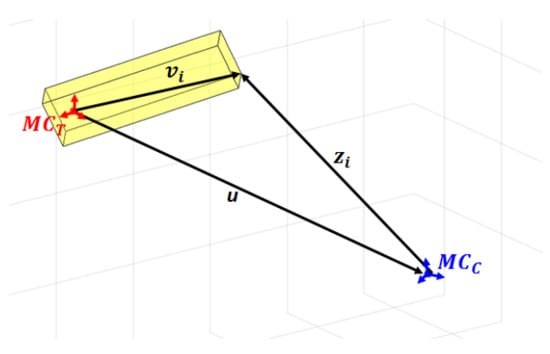 Here,  represents the position measurement of a marker relative to the chaser’s center of mass, and the rotation matrix  is derived from the MRP, meaning that the measurement models couples translation and rotational states. Figure 9 demonstrates how the vectors are arranged in the measurement equations [].