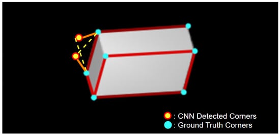 where  and  are the focal lengths in the x and y directions, respectively. Parameters  and  represent half the width and height of the image plane, respectively. In the pinhole camera model, they are used to ensure that the u and v coordinates are always positive. This transforms the image coordinate system to have a domain of  and  for u and v, respectively, rather than  and . This matrix is applied to the 3D points in camera space to project them onto the 2D image plane, producing pixel coordinates. The CNN module detects these pixel locations for the satellite’s corners.