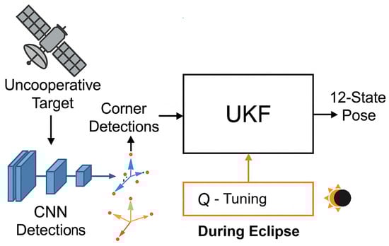 This paper presents a robust approach to relative pose navigation for the tumbling ENVISAT spacecraft, emphasizing the online collaboration between a filter and a CNN-based image processing camera. As part of this study, we introduce TinyCornerNet, a lightweight CNN specifically designed for robust corner detection in spaceborne imagery. Unlike large-scale models, TinyCornerNet achieves high accuracy while maintaining computational efficiency, making it well-suited for onboard or real-time processing. Its architecture was optimized to reliably detect structural markers on satellite targets under various noise and distortion conditions. The results demonstrated that TinyCornerNet outperforms traditional corner detectors in both accuracy and robustness. In each cycle, the CNN processes the incoming images to extract corner measurements, which the filter then uses to predict and update the uncertainty of the system. Overall, the proposed pipeline not only addresses the complexity of autonomous rendezvous with a non-cooperative target but also lays a foundation for future advancements in space debris monitoring and active removal. Additionally, a key contribution of this work is the adjustment of the process noise covariance matrix via covariance inflation during eclipse periods. This adaptation ensures the continued accuracy of the UKF, allowing it to maintain state estimation despite the absence of direct sensor updates. Monte Carlo simulations, with and without eclipse scenarios, demonstrate the robustness and consistency of the proposed method. In eclipse conditions, the  adjustment effectively compensates for the uncertainty introduced by the lack of measurements, keeping estimation errors within expected bounds. The reason is that  represents the uncertainty in the system’s dynamics, specifically the degree to which the model’s predictions may diverge from the true state due to unmodeled/unknown or highly nonlinear dynamics, disturbances, or inaccuracies in the dynamic model. By increasing the values in  during the eclipse, the filter acknowledges the higher spread of uncertainty and adjusts its predictions accordingly. A higher  value increases the predicted state covariance, allowing the filter to reflect the potential range of error in its predictions more accurately. This prevents the filter from becoming overly confident in its predictions, thus mitigating the risk of large deviations between the predicted and true states. Once measurements are available again, the filter can quickly recover, reducing the accumulated uncertainty and maintaining overall consistency. The scenario without an eclipse confirms the filter’s nominal performance with continuous measurements. These findings suggest that the proposed approach offers a scalable, reliable solution for space debris management and contributes significantly to the advancement of autonomous de-orbiting systems.