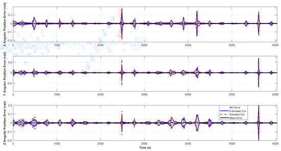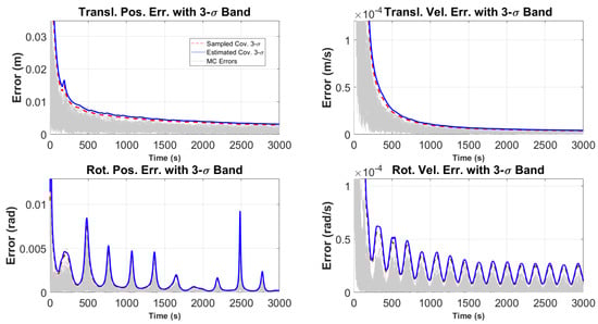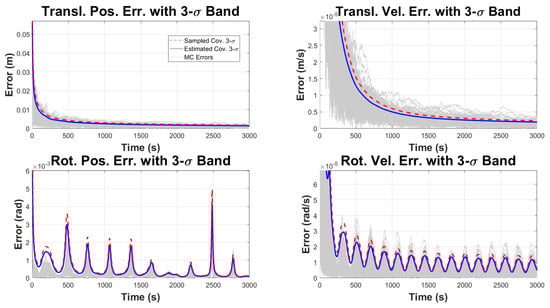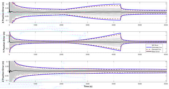 In addition to the eclipse scenario, a Monte Carlo analysis was performed for a scenario where no eclipse occurs, providing a baseline consistency check. In this case, the satellite’s markers remain visible throughout the simulation, allowing for continuous measurement updates in the UKF. The Monte Carlo errors, sampled error covariance three-sigma bounds, and estimated covariance three-sigma bounds are reported here. The results show that the filter consistently tracks the satellite’s state, with the errors remaining within the expected three-sigma bounds. Since no interruptions in measurements occur, the need for adjustments to the process noise covariance matrix is minimized, and the filter operates with nominal performance. This analysis demonstrates the filter’s accuracy levels, consistency, and robustness for the nominal condition. In Figure A1, Figure A2, Figure A3 and Figure A4, the red dashed lines represent the effective three-sigma values obtained from the sampled errors, while the solid blue lines represent the three-sigma values derived from the estimated error covariance matrix, and the gray lines are the Monte Carlo errors for no eclipse case.