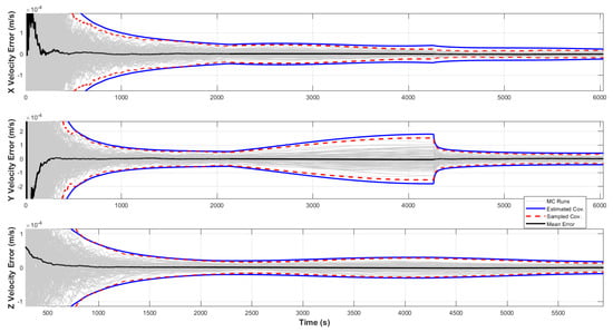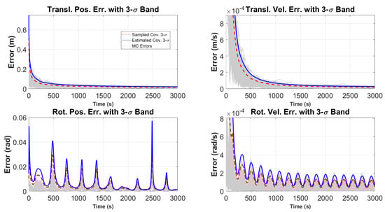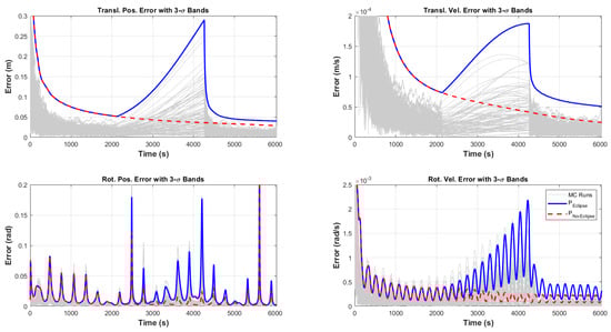 In order to mitigate the impact of missing measurements and maintain estimation quality, we introduce and adjust the process noise covariance matrix  during the eclipse, which starts around the 2000th s of the simulation and continues for approximately 35.57 min. While measurements are unavailable, the fidelity of the uncertainty estimate is merely based on the propagation step. In an ideal scenario, the predicted PDF, approximated as Gaussian by the UKF, perfectly describes the true non-Gaussian PDF, whose shape is unknown. In order to not lose custody of the target with an extreme confident success rate, the UKF predicted covariance needs to guarantee that the full uncertainties of the true PDF are enclosed in its prediction. This aspect is achieved through covariance inflation to ensure that the algorithm counteracts distributions with long tails and many outliers, which usually results from highly nonlinear dynamics (such as ENVISAT’s). The matrix  reflects uncertainties in the system dynamics, and increasing its values during the eclipse according to the covariance-inflating methodology helps to ensure that the predicted uncertainty adequately encompasses the potential spread of the state. This inflation prevents the filter from becoming overconfident in its predictions and helps retain robustness under high nonlinearity and absent measurements. As the system is highly nonlinear, and the distribution becomes non-Gaussian, the noise inflation prevents degeneracy from outlier observations or states, providing robustness from every possible revelation. As shown in the results, the covariance inflation guarantees that every possible Monte Carlo simulation, not just in a  boundary sense, is enclosed in the uncertainty to guarantee that the UKF does not lose fidelity and custody of the target. Once the satellite exits the Earth’s shadow and the eclipse ends, measurement updates resume, and the UKF rapidly reduces accumulated prediction error by incorporating sensor data. To assess the filter’s consistency under these conditions, Monte Carlo simulations were conducted. Figure 18 compares estimated covariances for eclipse and no-eclipse cases, where solid blue lines denote three-sigma bounds from the estimated covariance under eclipse, red dashed lines represent the no-eclipse case, and gray lines show the Monte Carlo errors. In Figure 19, Figure 20, Figure 21 and Figure 22, red dashed lines show three-sigma values from the sampled errors, solid blue lines represent the three-sigma values from the estimated covariance, black lines show the mean error, and gray lines denote the Monte Carlo realizations.