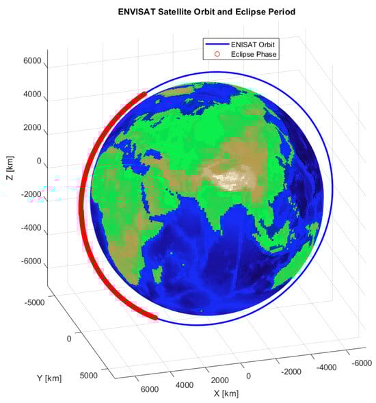 For the ENVISAT satellite, the eclipse duration was calculated to be 35.57 min. This eclipse occurs when the satellite passes into the Earth’s shadow, during which the Sun’s light is blocked, and no direct sunlight reaches the satellite. Regardless of possible detection due to other light sources, it has been assumed to be a worst-case scenario where, during this eclipse period, the corners and markers of the satellite will never be visible to the cameras used for measurement. As a result, there will be no measurement updates in the UKF during this time. The UKF relies on visual tracking to update the satellite’s state estimates, and without sufficient visibility, the necessary data for these updates will be unavailable. Therefore, during the eclipse period, the estimation process will continue without measurement updates, relying solely on the prediction step to propagate the relative pose uncertainties. Figure 17 visualizes the eclipse phase where the Sun is inserted far away in the  axis.