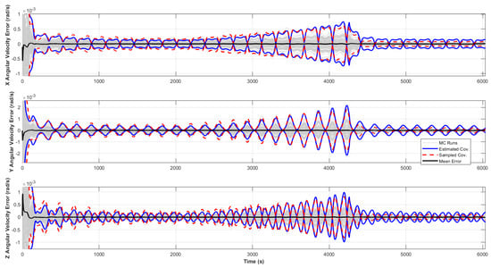 Again, in Figure 14, Figure 15 and Figure 16, the red dashed lines represent the three-sigma values derived from the estimated error covariance matrix, and the blue lines show that the effective three-sigma values obtained from the sampled errors are close to each other and encapsulating the Monte Carlo errors. Consequently, the UKF has performed well, maintaining estimation accuracy despite the challenges posed by reduced marker observations and other uncertainties in the simulation, such as the measurement noise on the sensors. The filter is able to predict its own uncertainties, and the initial large error covariance is reduced rapidly to steady-state values. Indeed, to show convergence, the figures are zoomed around the steady state, while the initial large uncertainties are out of the graph (for visualization purposes). The error spikes are visible around some points, especially for the rotational position and velocity errors. The fundamental reason behind this phenomenon is the positioning of ENVISAT in the camera frame and its orientation, which reduces observability. It is important to state that the filter robustness and accuracy are sensitive to the filter frequency, which is set at 1 Hz for this study. The filter tends to perform less accurately below this frequency threshold, while it stays convergent above this frequency due to the sampling rate and discretization errors.