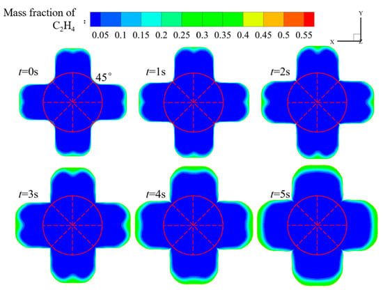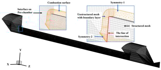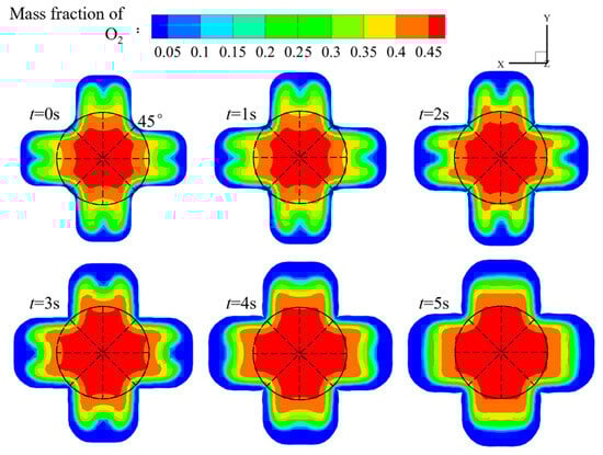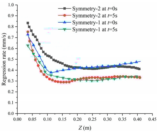 - A new, simplified, and updated model for the combustion surface based on the dynamic mesh technique was proposed. When the distance between the nodes on the combustion surface and the symmetrical plane is less than 0.01 mm, the nodes shift to the symmetrical plane, negating the function of adding source items to adjacent grids.