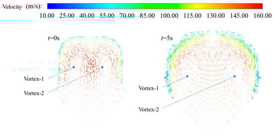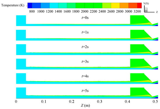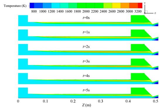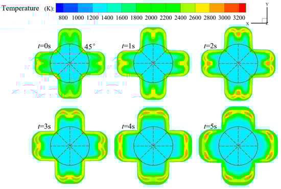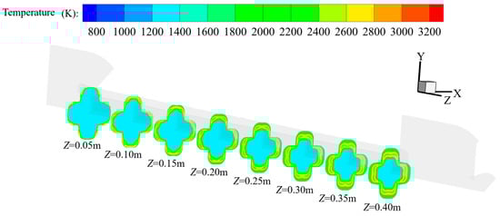 - The changes in the flow field structure and performance parameters during the operation of a cross-shaped grain in hybrid rocket motors were obtained. Notably, as the port expands, the high-temperature zone inside it changes from an “m” shape to an “n” shape. This occurs because the distance between the vortices on both sides of the symmetry plane gradually increases.