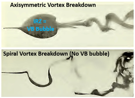 Two different vortex breakdown modes. Figure taken from Sarpkaya [31]. (Top): axisymmetric mode with vortex bubble (inner recirculation zone). (Bottom): vortex breakdown spiral mode.