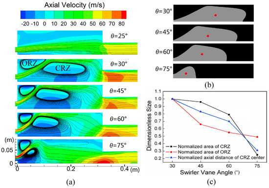 Characterization of a swirling flow with a swirling inlet boundary conditions at various angles to study the effect on the inner recirculation zone. Figure taken from Xi et al. [51]. (a) Flowfields (cases 9 to 13). (b) Contours and center positions of recirculation zones. (c) Sizes of zones as a function of the vane angle.