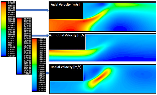RANS modeling with the Reynolds stress model of a swirling flow for configuration design (unpublished results from Palies doctoral thesis. From ((top) to (bottom)): axial, azimuthal, and radial velocities. Axial velocity ranges from −0.88 to 4.4 m s−1. Azimuthal velocity ranges from 0 to 4.67 m s−1. Radial velocity ranges from −0.38 to 2.28 m s−1. A solid body rotation of the flow is prescribed at the inlet.