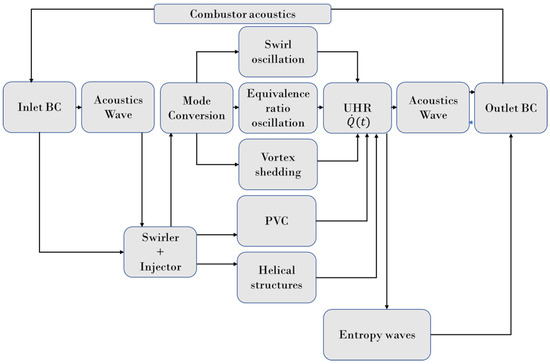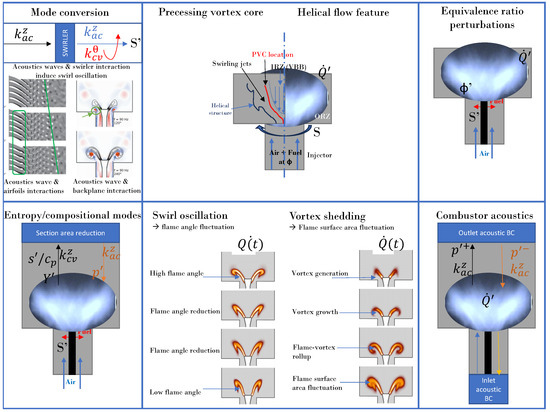 Chu and Kovásznay [82] introduced the notion that three modes of fluctuations or waves may be distinguished in a flow: acoustic, entropic, and vortical. These waves are characterized by their frequency, wave’s speed, and possible modal distributions for acoustics waves. It is important to define what is the mode conversion process in this context. In the field of study of waves, it is the change from one type of wave to another type. This process is not limited to the combustion dynamics field (as can be seen in Palies et al. [28], Noiray et al. [83], Komarek and Polifke [84], Palies et al. [85]) and has examples in other fields in which the literature is beyond the scope of the present article. It has relevant applications in turbomachinery for example.