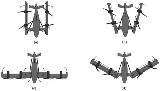 In this section, we present a mathematical description of the controlled object model used in this study. Figure 1 shows a simplified top-down view of the tilt-wing UAV under investigation, transitioning from rotary-wing mode to fixed-wing mode ((a), (b), (c)) and then from fixed-wing mode back to rotary-wing mode ((c), (d), (a)). The white sections in the figure represent the fixed-wing control surfaces. The rigid internal components of UAVs are depicted by dashed lines in the figure. These components, when moved by a pushrod along the direction of the solid arrows, cause the wings to rotate around the joint.