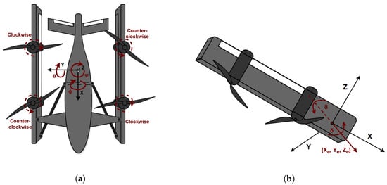 Three coordinate systems are primarily used: the ground coordinate system, the body-fixed coordinate system, and the wing-fixed coordinate system [26]. The ground coordinate system follows the conventional North–East–Down (NED) convention, with the origin located at the UAV’s center of gravity in rotary-wing mode. The body-fixed coordinate system follows the conventional Forward–Right–Down (FRD) convention (Figure 2a), with its origin located at the UAV’s center of gravity in rotary-wing mode. The figure also indicates that the front-right and rear-left rotors rotate counterclockwise, while the others rotate clockwise. This configuration cancels the net yaw torque, thereby supporting the symmetry assumptions in the torque model. The wing-fixed coordinate system is defined with the tilt-joint as the origin, with the x-axis pointing forward, parallel to the longer edge of the wing; the y-axis is directed to the right, perpendicular to the wing surface; and the z-axis is directed downward, parallel to the shorter edge of the wing (Figure 2b).