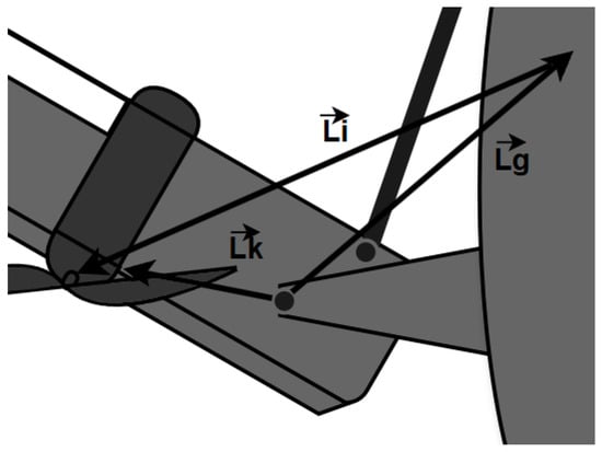 It is important to note that during the transition, the center of gravity shifts forward toward the nose. Therefore, we define the vector from the tilt-joint to the center of gravity as and the vector from the tilt-joint to the motor as . The moment arm can then be expressed as (Figure 3). As the center of gravity shifts during the transition, the pitch-axis moment of inertia also varies accordingly. Following the parallel axis theorem [28], we define the time-varying inertia , where is the intrinsic moment of inertia of the UAV body about the pitch axis, and , are the horizontal and vertical displacements of the center of gravity relative to the tilt joint, extracted from the defined vector . This modeling approach captures the inertia variations caused by center-of-gravity shifts, thereby enhancing the physical fidelity of the dynamic model. All formulations follow the structure presented in Equation (3).