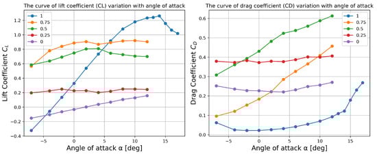 These data were processed using multidimensional interpolation [29] to ensure the validity of the data for any condition within a tilt progression range of 0–1, angle of attack range of −7° to +17°, and control input range of ±25°. Figure 4 presents the lift and drag coefficient curves under different tilt progressions and angles of attack. Analyzing the curves in the figure, when the tilt progression is 0, lift is provided primarily by the rotors, while the wings contribute almost no lift. When the tilt progression reaches 1, the lift variation with angle of attack exhibits characteristics typical of fixed-wing aerodynamics, where increases with the angle of attack initially, followed by a stall beyond a certain angle. Drag is mainly influenced by friction drag and pressure drag, with gradually increasing at first and then rising sharply after the stall angle [30]. At tilt progressions of 0.25, 0.5, and 0.75, gradually increases, indicating a growing contribution of aerodynamic lift from the fixed wings. becomes more sensitive to angle-of-attack variations, showing a transitional behavior on the curve.