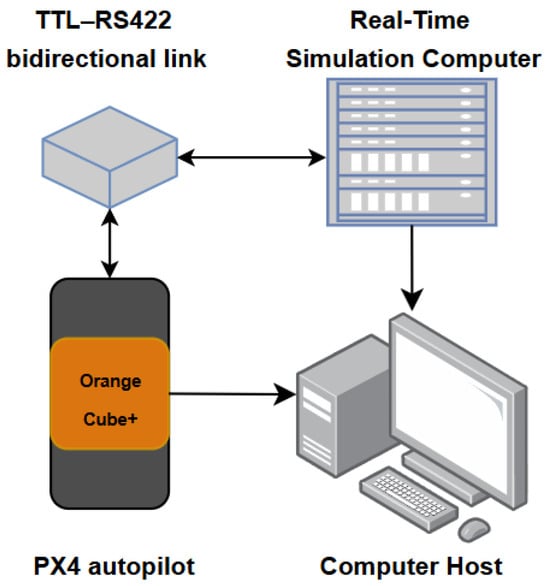 This experiment focuses on learning control strategies using PX4 autopilot hardware (Orange Cube plus) and a real-time simulation computer that includes the dynamic model of the tilt-wing UAV (Figure 5). In the HIL simulation, the autopilot processes the state variables of the UAV generated by the dynamic model and outputs control commands to the model. Through repeated iterative simulations, control outputs corresponding to various states of the UAV are obtained. The connection between the two systems is established using a TTL-to-RS422 module to meet the baud rate requirement of 921600 [38].
