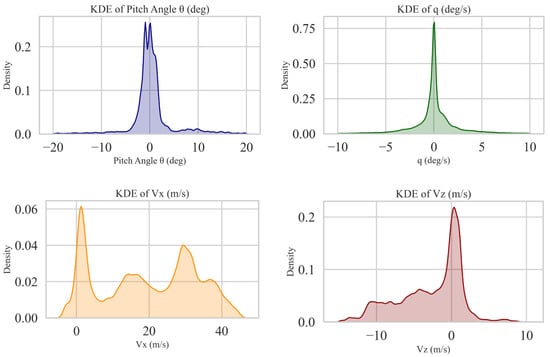 As shown in Figure 6, Kernel Density Estimation (KDE) is used to visualize the state distribution of the offline dataset. The dataset captures diverse flight conditions. Both and q are centered near zero, reflecting overall stability with minor perturbations. A negative peak in aligns with the nose-down stability observed in fixed-wing mode [40]. exhibits a multimodal pattern across hover, transition, and cruise phases. is near zero but skewed negative due to frequent descent scenarios, enabling the agent to recognize excessive altitude loss as risky. This distribution diversity ensures broad scenario coverage for training.