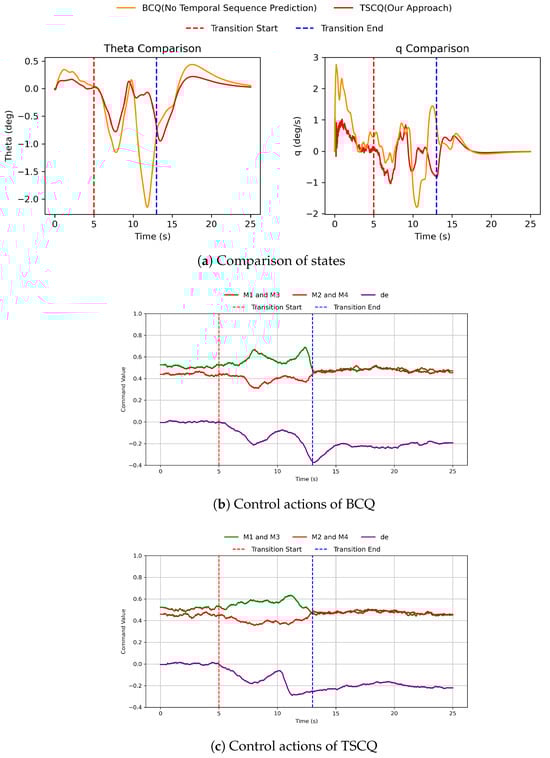 The ablation experiment of TSCQ and BCQ (no temporal sequence prediction) highlights the crucial role of temporal prediction in enhancing control performance with temporal information. As shown in Figure 8, TSCQ, by integrating temporal sequence information, demonstrates proactive control behavior, which is absent in BCQ. Around the 11th second of the flight, TSCQ anticipates a downward trend in , allowing it to suppress the trend in advance and reduce errors. This anticipatory behavior is more evident in the q plot, where TSCQ maintains smoother angular velocity and avoids abrupt spikes, whereas BCQ suffers from irregular control bursts, leading to angular instability. Specifically, BCQ experiences oscillations in and q, reaching ±2° and ±3°/s, respectively, while TSCQ limits these deviations to approximately ±0.8° and ±1°/s. Lacking temporal foresight, BCQ generates motor and control surface outputs only after state deviations occur, resulting in delayed correction and reduced stability. In contrast, around 5 and 10 s, the TSCQ Temporal Sequence Prediction architecture enables it to model the evolution of system states and implement feedforward control, allowing it to generate more effective actions in advance. This leads to a smoother and more robust transition process. This ablation confirms that the integration of the temporal sequence modeling is essential to accurately model transition dynamics. BCQ primarily constrains the distribution of single-step actions to avoid extrapolation beyond the offline dataset. In contrast, TSCQ introduces an additional prediction mechanism to ensure the consistency of entire action sequences, thereby further reducing the likelihood of generating OOD data.