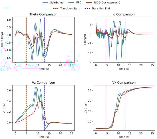 In the comparison of forward velocity (), all three control strategies, GAIN scheduling, MPC, and TSCQ, exhibit similar behavior during and after the transition. Following the initiation of transition (around 5 s), the aircraft pitches downward and accelerates, resulting in a clear increase in . This reflects the conversion of vertical thrust into horizontal propulsion as the vehicle shifts from hover to fixed-wing flight. All controllers reach a comparable final forward velocity of approximately 25 m/s in fixed-wing mode, indicating successful completion of the transition in terms of horizontal acceleration. The similarity in trajectories suggests that, while TSCQ significantly improves pitch and vertical velocity control, forward acceleration dynamics are primarily influenced by the vehicle’s aerodynamics [47] and transition profile rather than the control strategy itself.