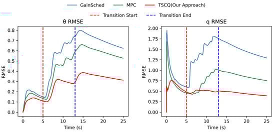 As shown in Figure 10, to provide a more intuitive comparison of control performance, we use the RMSE metric. Both gain scheduling and MPC exhibit a significant increase in RMSE during the transition phase, indicating large deviations from the set point and resulting in error accumulation. In contrast, TSCQ shows a much smaller increase in RMSE, with a notable decrease and fluctuation between 8 and 13 s, indicating that TSCQ adjusts the control actions earlier and more effectively than the other methods. Similarly, both gain scheduling and MPC experience large fluctuations in q RMSE during the transition, while TSCQ’s RMSE significantly drops to approximately 0.25, much lower than the other two methods. This sharp decrease reflects TSCQ’s ability to adjust control actions more effectively through proactive prediction, mitigating oscillations in q. In general, TSCQ outperforms traditional approaches in terms of control accuracy and stability, particularly in the control of key flight parameters such as , q, and .
