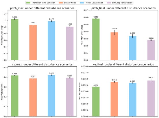 To assess the robustness of TSCQ under real-world uncertainties, Monte Carlo simulations are conducted across four representative perturbation scenarios: transition time variation, sensor noise, motor degradation, and lift/drag disturbances. For each case, 300 randomized trials are performed with disturbances sampled from uniform distributions, whose ranges are based on physically realistic error margins. The results report the mean and 95% confidence intervals of four key metrics: maximum pitch error (), final pitch error (), maximum vertical speed error (), and final vertical speed error (). Detailed perturbation settings and success rates are summarized in Table 2.