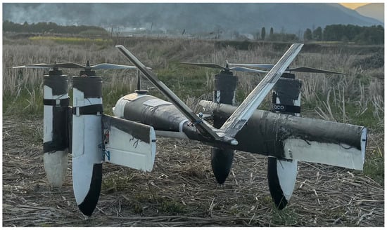 As shown in Figure 12, other members of the project team have completed a prototype of the newly designed tilt-wing UAV and successfully conducted full-transition flight tests based on a gain scheduling strategy. The prototype serves as the physical foundation for the modeling work in Section 2. Wind tunnel experiments on this airframe provided the aerodynamic coefficients for the five representative tilt configurations. In addition, geometric parameters such as moment arms, rotor positions, and center-of-gravity offsets used in the model were derived from its CAD design and mass distribution. Future research will focus on optimizing the neural network architecture for real-time deployment, with plans to implement the algorithm on the physical platform to comprehensively evaluate its feasibility and robustness in real-world flight missions.