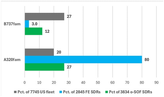 The two most prevalent aircraft types in the US fleet were the Boeing 737 family (B737fam) (27%) and the Airbus 320 family (A320fam) (20%), including all variants. Figure 1 illustrates three data points for each of these aircraft types: the percentages of the US fleet in operation, fume event SDRs, and o-SOF SDRs, respectively, all averaged over the four years of interest. A320fam aircraft were over-represented in fume event SDRs that US airlines sent to the FAA (Figure 1) and in the category of reports classified as CWFE (n = 297 of 492; 60%).