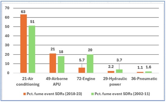 The nature of the 2002–2011 and the 2018–2023 fume event datasets appears to be comparable; airlines filed 94% of the 2002–2011 SDRs and 93% of the 2018–2023 SDRS under the same five ATA maintenance manual chapters (Figure 2).