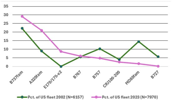| Aircraft Type | Pct. of US Fleet 2002 (n = 6157) | Pct. of US Fleet 2023 (n = 7970) |