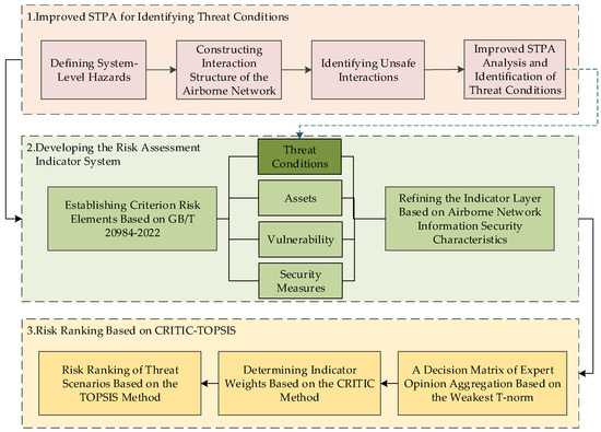 In addressing the limitations of traditional information security assessment methods for complex airborne network threat identification and risk assessment, this paper proposes an airborne network information security assessment framework based on the improved STPA-TOPSIS method. The flowchart of framework is illustrated in Figure 1, and the comprehensive information security assessment process comprises three components.