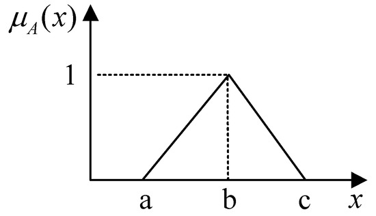 The triangular fuzzy number is denoted as , and its membership function is shown in Figure 2 and the Equation (1):