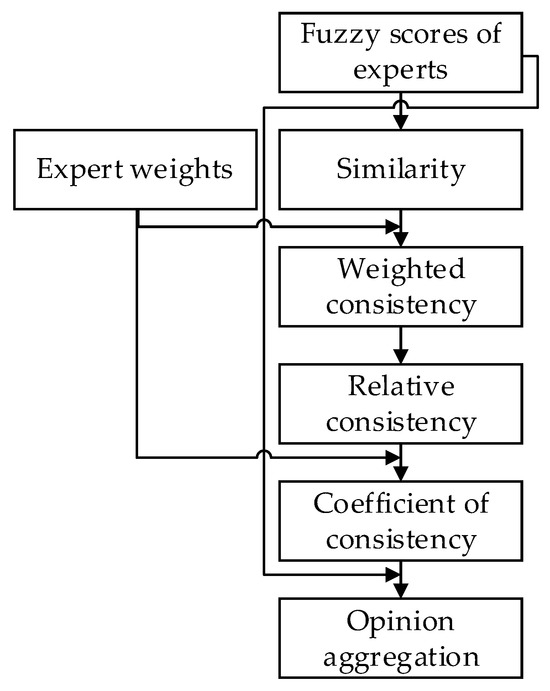 In Formula (13), the weights of experts and the relative consistency are combined to calculate the aggregated weight of expert . Finally, Formula (14) aggregates expert opinions based on the operator to obtain the overall fuzzy number for a threat scenario under a specific evaluation criterion. The overall flowchart of the expert opinion aggregation process based on is shown in Figure 3.