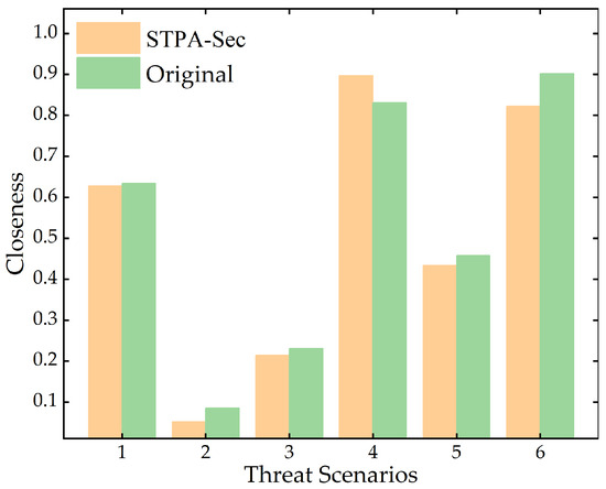 To address the construction of the airborne network risk assessment index system, the threat scenario assessment results of the original airborne network risk assessment index system [17] are compared with those of the improved index system, which integrates the STPA-Sec method discussed in this paper. The same expert panel was invited for scoring, with the CRITIC-TOPSIS method employed for assessment. The comparative assessment results are illustrated in Figure 8.