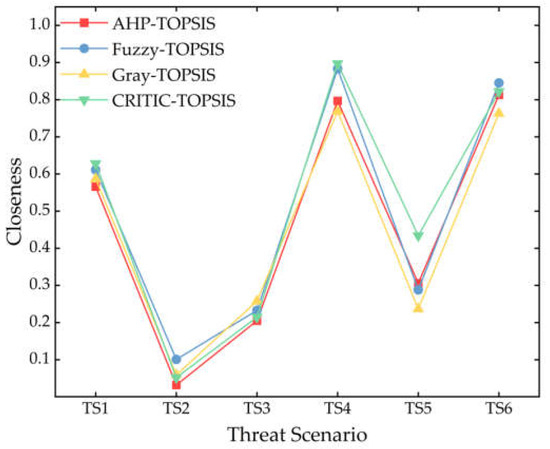 The proposed method also demonstrates ranking differentiation due to its capacity to objectively calculate indicator weights through the CRITIC method, thereby enhancing objectivity and accuracy. In Figure 9, CRITIC-TOPSIS reveals higher closeness degrees across multiple threat scenarios, particularly in TS1, TS4, and TS5. This suggests it provides more precise and reliable risk assessment results for specific threat scenarios. Compared to other methods, its curve exhibits smaller fluctuations, reflecting more stable evaluation results that are less influenced by scenario changes. Overall, the improved STPA-TOPSIS method shows significant advantages in terms of accuracy and stability in risk assessment.