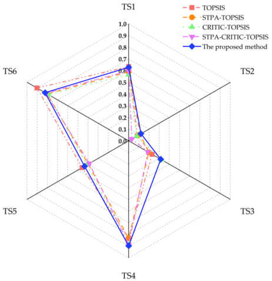From the comparative experiments in three ways, TS2 consistently has the lowest risk ranking, while TS4 and TS6 have the highest. This aligns with other methods, proving the consistency and validity of our approach.