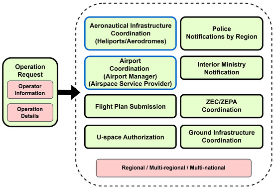 Figure 1 illustrates the different stakeholders with whom drone operators must coordinate according to current EU and Spanish regulation [5,6]: airports, aerodromes, heliports, critical ground infrastructures, protected natural areas as a result of existing geographical areas, and national or regional police as a result of national security. The coordination with each of these stakeholders may slightly differ in the details, but shares the same underlying concept: if the drone mission interacts with a geographical area (defined under some spatial and/or temporal conditions in the regulation), drone operators should formally request the establishment of an operational coordination with the corresponding organizations. Once coordinations are established, drone operators are obliged to comply with several safety-related restrictions that may be imposed on them. Infrastructure operators may introduce further restrictions within reason for operational safety. Moreover, in most cases, on the day of the mission, drone operators should announce both the initiation and completion of the flights and, at the same time, remain vigilant in case the mission should be suspended due to an emergent situation.