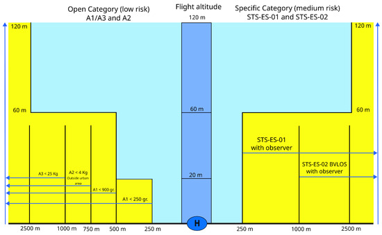 As previously indicated, SEM applies a risk-based strategy to determine which drone operations within the areas of responsibility around its network of heliports present an acceptable risk and which ones are unacceptable (refer to Table 1 for a summary of EASA’s risk classification). SEM accepts any operation beyond 2500 m from the heliport without further restrictions, regardless of the altitude. When operating closer, coordinations are accepted for open category flights depending on the drone classification (A1–A3) or the STS scenario for the specific category. However, this is limited to operations performed below 60 m. Coordinations are generally rejected above that altitude. See Table 4 and Figure 4 to review the restrictions introduced by SEM.