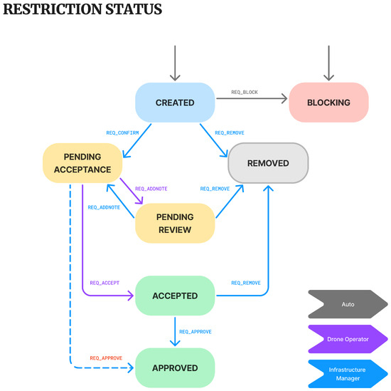 In the initial stages of the workflow, the infrastructure manager can accept or remove restrictions and communicate with drone operators by adding or responding to notes. The state transition model aims to progress a coordination request from “Created” to “Coordinated” status efficiently, requiring minimal input from both infrastructure managers and drone operators.