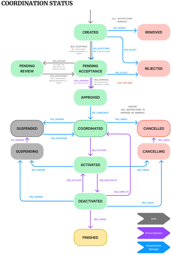 The overall proposal is built on formalizing the various restrictions that may apply to a coordination process. Restrictions are not only specified by airspace volumes but may also include temporal factors, drone characteristics, operational profiles, etc. Such a formalization enables the natural extension of its scope to new requirements, following a concept similar to object inheritance. Furthermore, the whole coordination workflow is described through several state-transition diagrams, formalizing the various actions required along the coordination process. At each transition step, it is properly defined which stakeholders are responsible for acting and under which circumstances that transition can be carried out automatically, eliminating the need for human intervention, thus significantly improving overall efficiency.