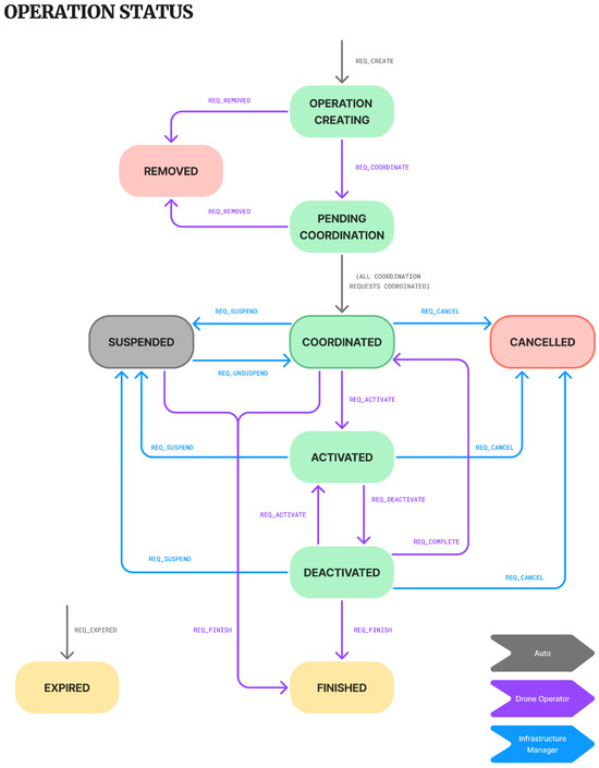 A coordination request is the key object enabling infrastructure managers to track the coordination process with drone operators. Each coordination request is defined by a unique identifier, a reference to the corresponding operation request (enabling access to the drone operator information and the operation details), and references to each corresponding infrastructure manager (to encapsulate general restrictions) or to each particular infrastructure (to encapsulate the specific restrictions associated to each infrastructure).