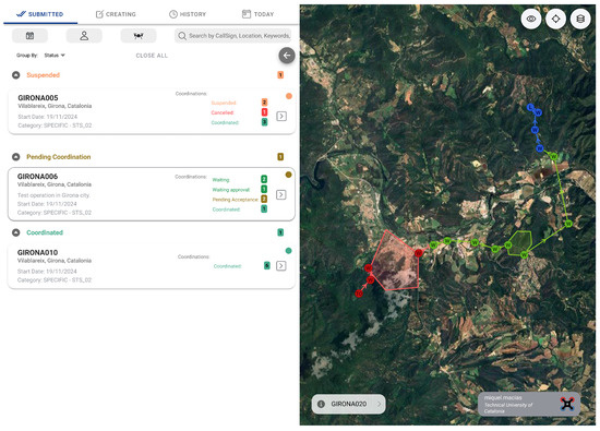 When an operation is ready, the drone operator should notify the infrastructure manager by activating the operation. This action is reflected on the “Today Coordinations” page, which provides operators with a comprehensive view of all operations scheduled for the current day, distinguishing them depending on the state of the operation. This page enables them to manage concurrent events while being aware of all planned and ongoing drone activities in the area surrounding their infrastructures.