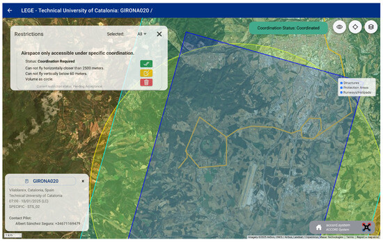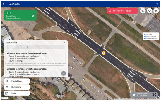 ACCORD is currently being tested within the Catalonia geographical context. In this region, there are around 100 aeronautical infrastructures. Six airports are managed regionally and nationally. Up to 55 heliports are managed by various Catalan agencies, 20 small aerodromes are managed by individuals, aeroclubs, etc., and some additional heliports are associated with key infrastructures. Article 41 of Royal Decree 517/2024 has defined UAS geographical zones (see Table 3), where any drone operation requires coordination between the drone operator and the infrastructure manager.