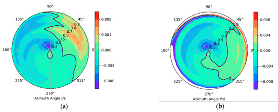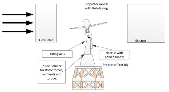 The pure hub and supporting parts were first measured with the advance ratio equivalent wind speed, and the longitudinal and lateral moments measured by the balance were recorded. Then, in all the operating conditions, the rotor was trimmed to have minimum pitch and roll moments at the rotor hub or those equivalent to the previously recorded pitch and roll moments with only hub and supporting parts. The trim process is automatic once the target thrust, pitch, and roll moments are set manually according to the previous hub moments measurement. The tolerance of the force and moments can be adjusted to have a high efficient trim procedure and acceptable repeatability. Different to the TTR test, the proprotor mast tilts up- and downward instead of a using yaw angle to represent the shaft angle, since the proprotor gravity also contributes to the loads. All the data presented here are non-dimensional, Refs. [5,10], with moments being non-dimensionlized with the Equation (1) and forces with Equation (2).