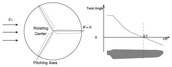 where is the shape function matrix, is the distributed load, s are the Gaussian points, and are the corresponding weights. With such a method, large deformations of rotor blades are decomposed to moderate deformations of beam elements. Nonlinear strain–displacement relations are used to account for geometric coupling between bending, torsion, and axial deformation (Ref. [26]). Coupling between deformations, such as bending-torsion or extension-bending, is modeled via the stiffness matrix , where off-diagonal terms reflect interactions, derived from cross-sectional properties.