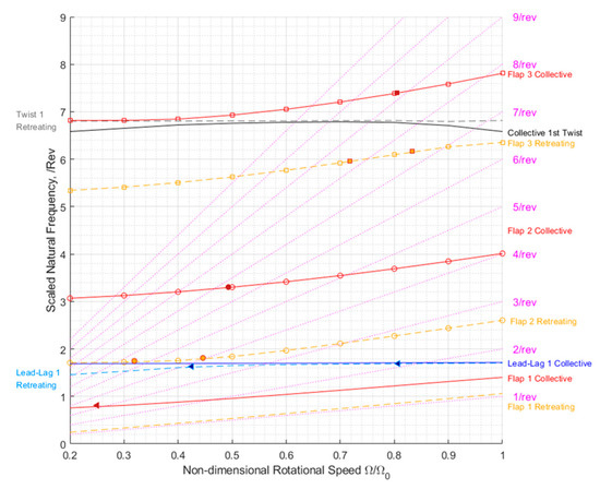 The experiment with the increasing rotational speed process was conducted to identify the natural frequencies of the rotor. The rotor collective angle was set to 0 degrees, and the rotational speed was increased from 0 to the standard rotational speed. The calculated modal frequencies are plotted in Figure 2, where identified natural frequencies are scattered with filled markers as well.