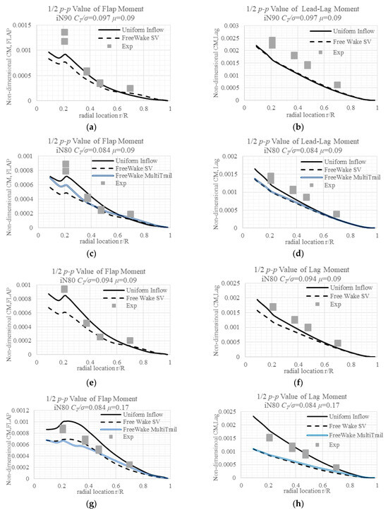 The linear inflow model predicts higher 1/2 p-p values of flap moments. The single tip vortex free wake model and the multi-trailed vortex free wake model yield similar results with little difference outboard. This difference vanishes as the lift coefficient increases. It is noticeable that with a multi-trailed vortex-free wake model, a trim task may take up to 9 h. The measured alternating lead-lag moments lie between the values predicted by the linear inflow model and the free wake model; as the thrust coefficient increases, the free wake model results become closer to the measured data.