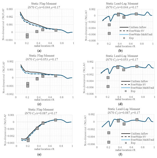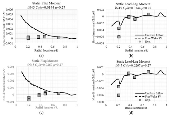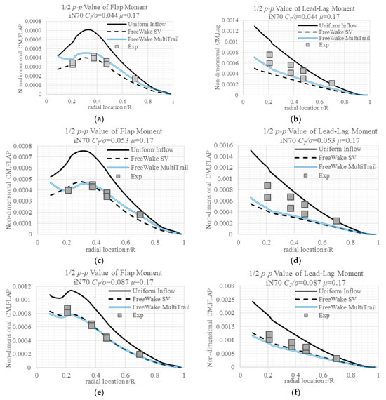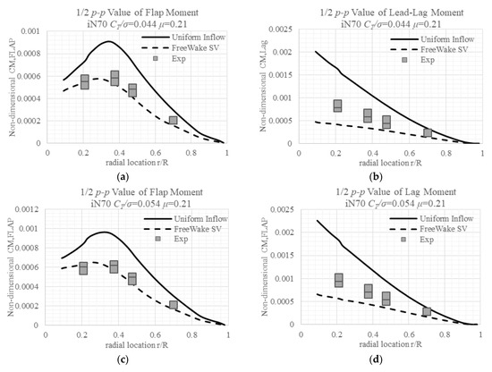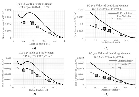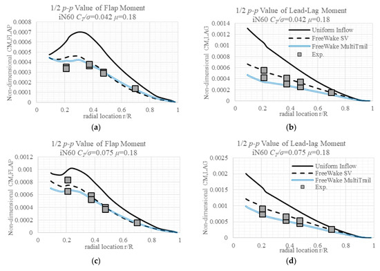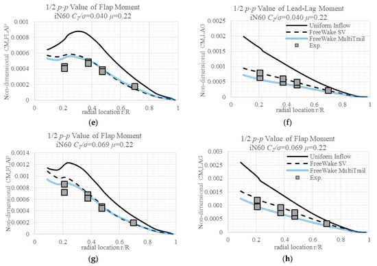 The measured lead-lag moments throughout the radial locations are larger than the simulated results by either inflow model, except the case with a higher advance ratio and lower CT/σ. The White–Blake inflow model–predicted lead-lag moments are generally smaller than the measured value, with values of certain cases at certain areas coinciding with the measured values. While there is a deficit in the Free Wake SV model predicted lag moments, there is no big difference between the multi-trailed model and SV Free Wake models in terms of lag moments’ prediction.