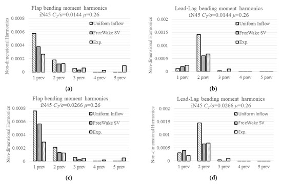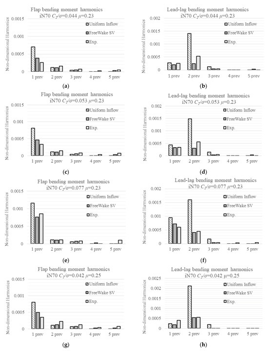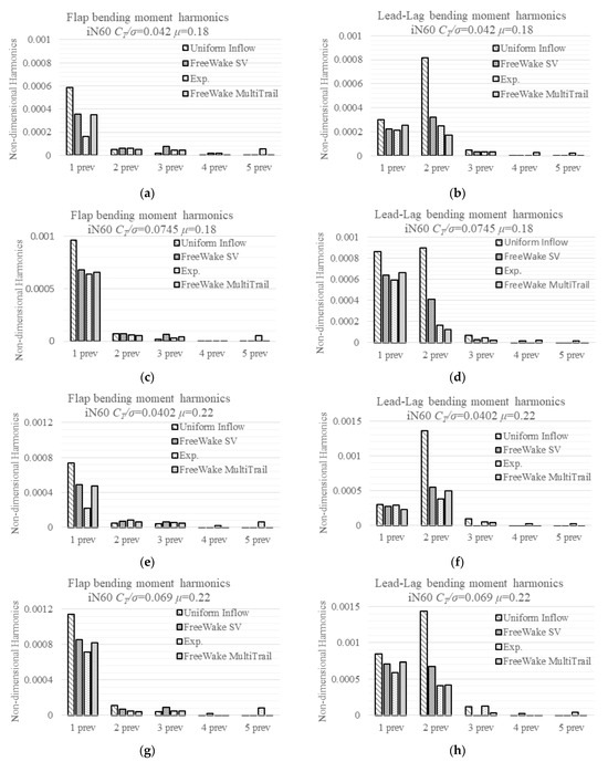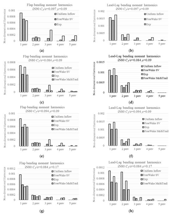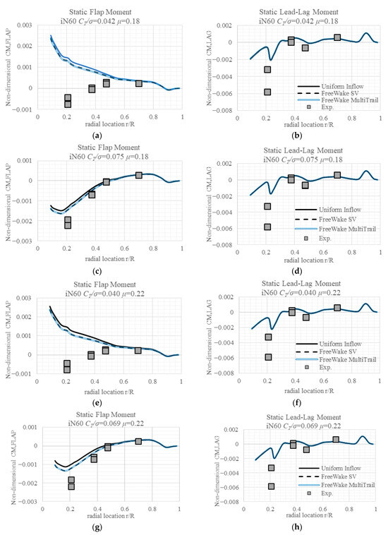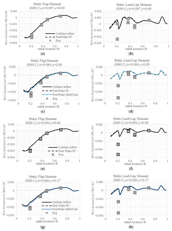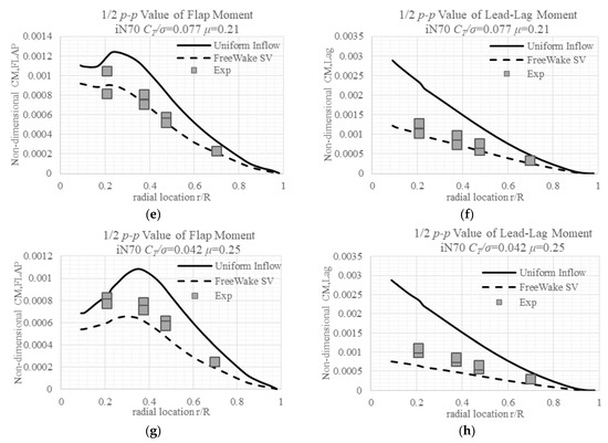 The detailed difference between the model predicted moments and the measured ones, as well as the blade-to-blade variation, is summarized in Table 3. Case 802 (Figure 4d) and case 812 (Figure 4h) show that as μ increases, the linear inflow model predicted flap moments at 0.21 R changes from deficit to excess, and difference increases at other locations; the predicted lag moments show a similar trend, with the values becoming closer to the measured ones. The free wake model predicted that flap moments’ difference decreases while lead-lag moments’ difference increases. They do not change much as the advance ratio increases or nacelle angle decreases. Case 903 (Figure 4b) and case 803 (Figure 4f) show almost the same change in the linear inflow predicted difference as the nacelle angle decreases for both flap and lead-lag moments. The free wake model predicted that both flap and lag moments do not change much.