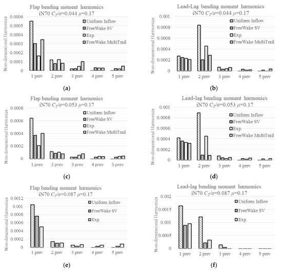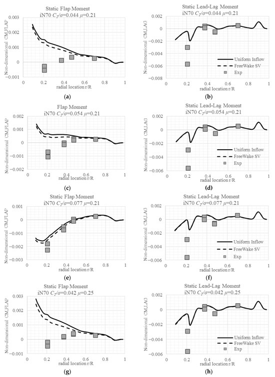 The predicted and measured differences of blade flap and lead-lag moments for cases with nacelle incidence 70° are summarized in Table 4 and Table 5. Comparing cases 710, 711, and 713, the linear inflow model predicted that the flap moments’ difference does not change until the thrust coefficient increases to a certain level; this level also determines whether the inboard static flap moments direction can be predicted correctly, as is shown in Section 4.2.2. The lead-lag moments’ difference does not show drastic changes. The trends of linear inflow flap do not hold for a different advance ratio, comparing 720, 721, and 722, and the flap merely remains at the same level, around +50%, and the lead-lag show close values near +100%. This means the linear inflow predicted flap is sensitive to the advance ratio μ, and lead-lag is a weak function of CT/σ but a strong function of the advance ratio. This can also be seen from cases 710, 720, and 740, and the lead-lag at 0.21 R increases from +62% to +137%.