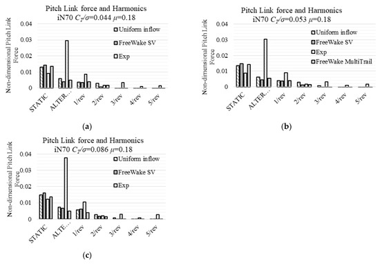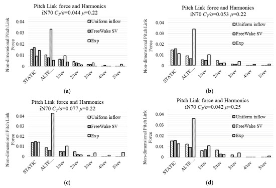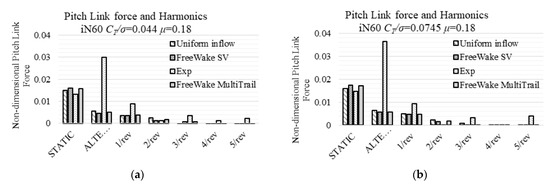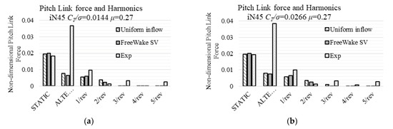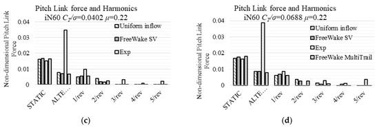 These two comparisons have a common characteristic: there is an increase in the overall inflow ratio. Since the linear inflow model (White–Blake model) uses empirical coefficients from helicopters, the rotor blades of which have a relatively smaller negative twist compared to proprotors’, those empirical values should consequently be adjusted to fit a certain rotor. Even with Coleman–Feingold Inflow model, which includes the overall inflow ratio into the distribution function, the alternating structural moments remain the same magnitude.