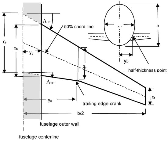Here, ct is the tip chord, cc is the chord at the location of the crank in the wing’s leading and/or trailing edge and cr is the root chord; the wingspan is b and the spanwise location of the wing crank is yc. This equation and others developed here apply to wings with leading and trailing edges comprising straight segments which may be cranked at a single spanwise location. The gross planform reference area calculated in this manner was applied to all airplanes to maintain consistency; they were within ±1% of the values cited in the open technical literature, except for those few which were based on different definitions of reference area.